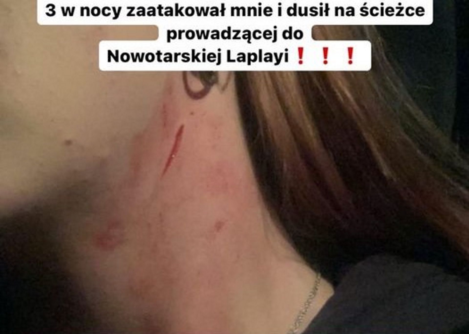 „Achtung! Ein gesuchter Mann, der mich heute um 3 Uhr morgens auf dem Weg zum Nowy Targ LaPlaya angegriffen und erwürgt hat. Er trug weiße Tarnhosen, eine schwarze Baseballkappe und ein schwarzes Sweatshirt. Wenn Sie wissen, kann es einer Ihrer Freunde sein „Haben Sie ihn während des Konzerts in dieser Gegend gesehen, lassen Sie es mich bitte wissen“, ruft die Frau.