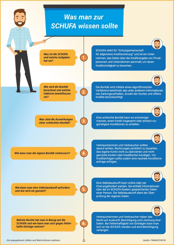 Viele Verbraucherinnen und Verbraucher wissen wenig oder gar nichts über die SCHUFA. Das ist aber falsch, denn wer diese Daten nicht genau kennt, läuft Gefahr, in seiner wirtschaftlichen Handlungsfähigkeit stark eingeschränkt zu werden. In der folgenden Grafik sind die wichtigsten Daten noch einmal übersichtlich und leicht verständlich zusammengefasst. Jeder Verbraucher muss sich mit seinem eigenen SCHUFA-Score auseinandersetzen. Nur so kann er verhindern, dass sich die Daten negativ auf sein Leben auswirken. Auch wenn ein negativer Eintrag das Leben erschweren kann, gibt es noch Möglichkeiten. Wer zum Beispiel wegen der SCHUFA keinen Kredit mehr bekommt, muss auf einen Kredit ohne SCHUFA ausweichen. Diese sind zwar etwas teurer, ermöglichen aber dennoch größere Anschaffungen.